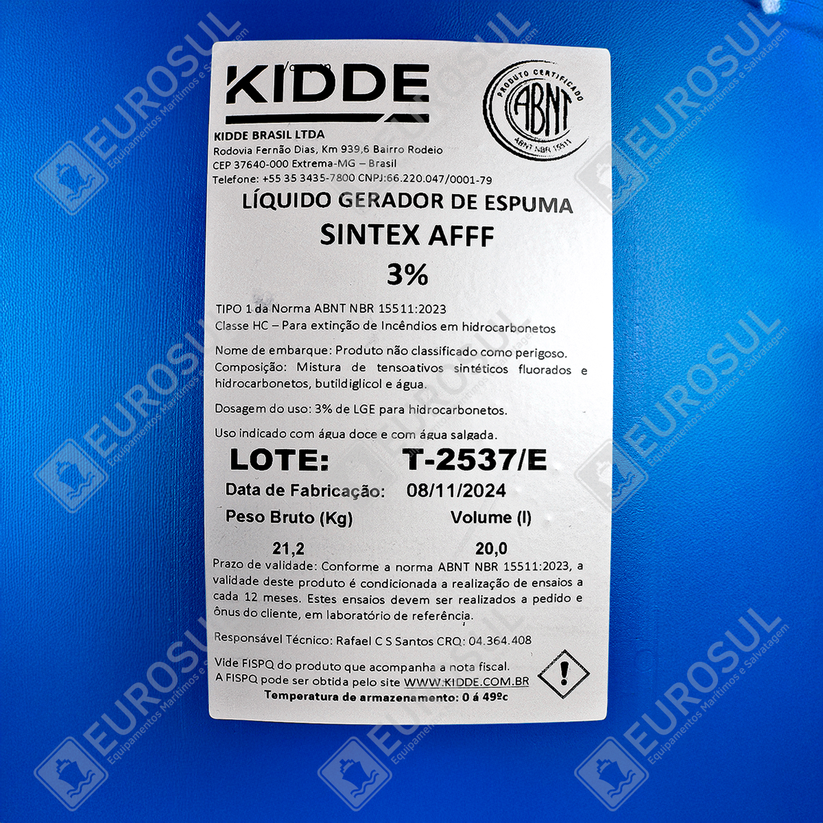 The Kidde 3% HC Sintex Foam Foam Generator (LGE) is a highly efficient agent in fighting flammable fluid fires, especially hydrocarbons (HC class). Its advanced formulation, composed of fluoridated synthetic surfaces, hydrocarbons and butylglycol, provides rapid foam formation, blocking oxygen and avoiding reignition. Developed for applications in offshore, sea and industrial environments, this product maintains high performance in freshwater and salt water. Certified by ABNT NBR 15511: 2023, offers full compliance with national and international security standards.